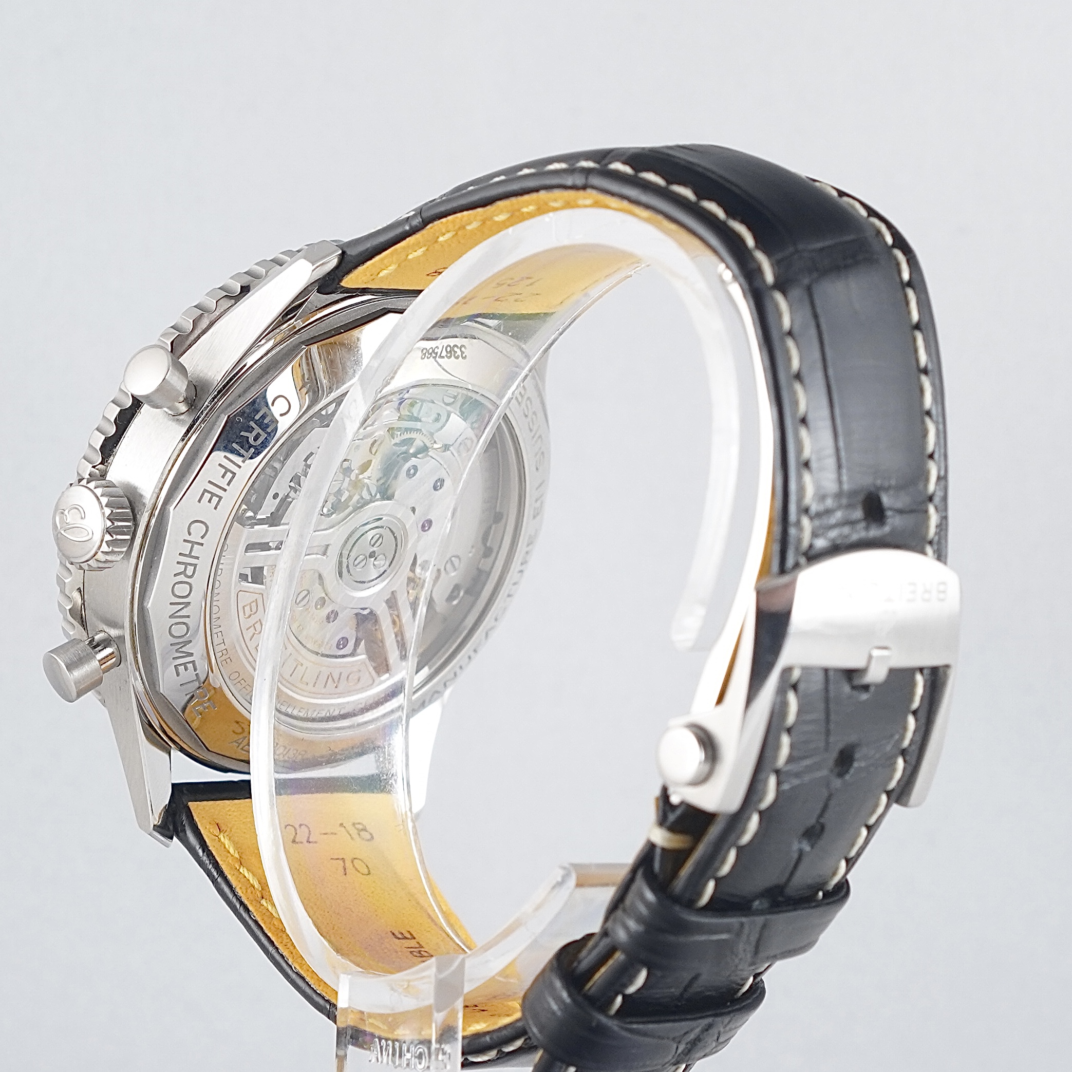 Erittäin näyttävä ja hienokuntoinen Navitimer vaalean sinisellä taululla. Fullset, takuukortti leimattu 1/2022. Valmistajan takuu voimassa 1/2027 asti. Safiirilasikkeet molemmin puolin, teräsrunko, ajanotto ja päivyri. Alkuperäinen nahkaranneke teräksisellä soljella. Ikoninen ilmailukello, jonka sisäkehä toimii myös laskutikkuna.
