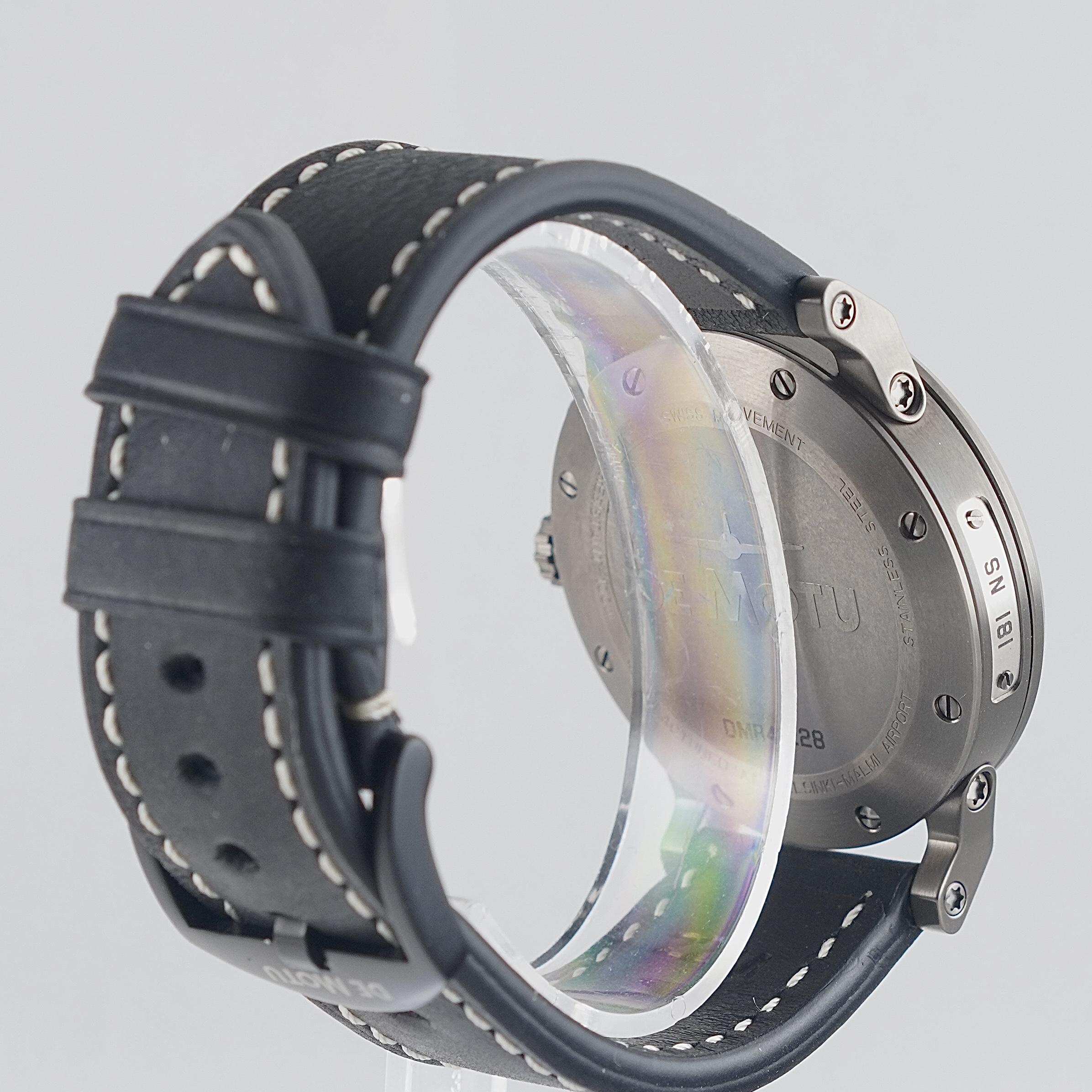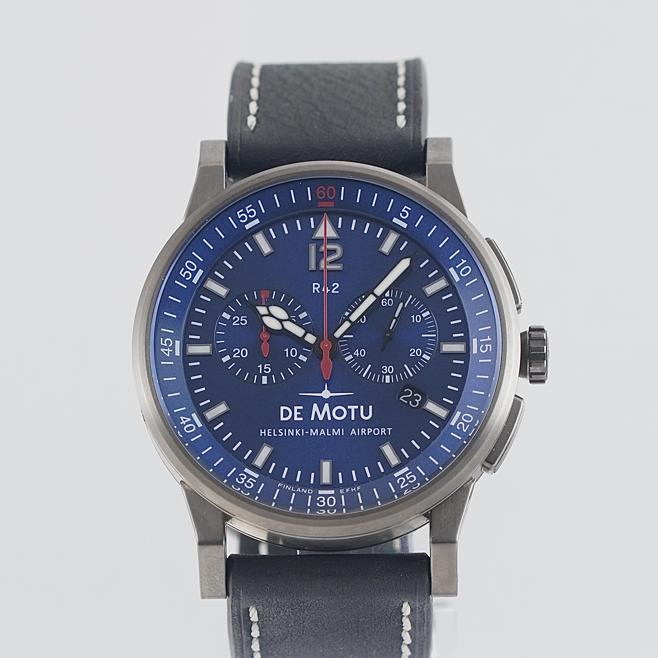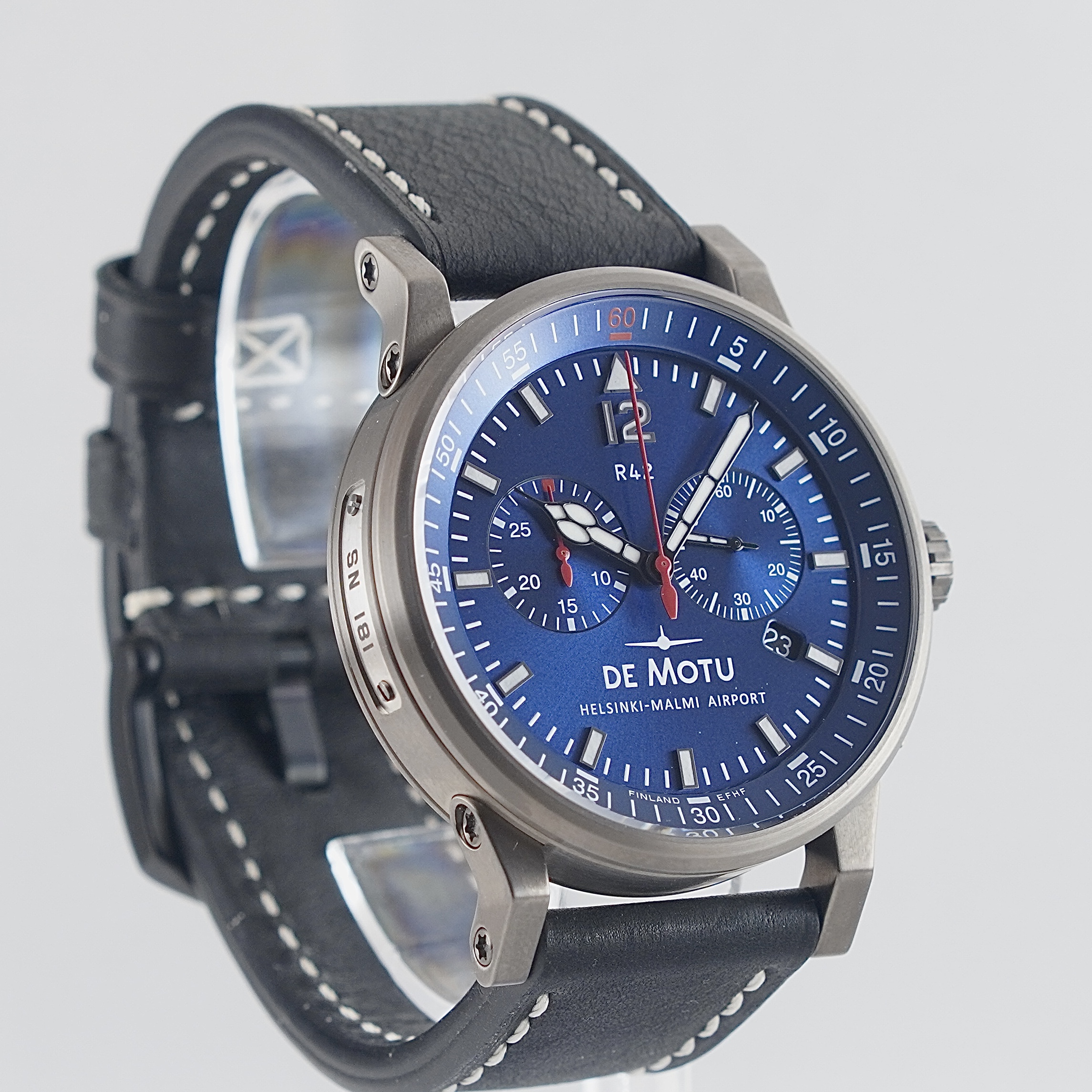 Uudenveroinen De Motu sillä upeimmalla, eli sinisellä taululla. Complete setti, jonka takuukortti päivätty 2/2026. Valmistajan takuu voimassa 2/2028 asti. Kello huokuu ilmailuhenkeä ja kunnioittaa nykyään ilmailutoiminnasta lakkautetun Helsinki-Malmin lentoaseman historiaa. Kellosta löytyy safiirilasike, ajanotto sekä päivyri. Mustalla nahkarannekkeella, joka kellossa ollut ostohetkellä.